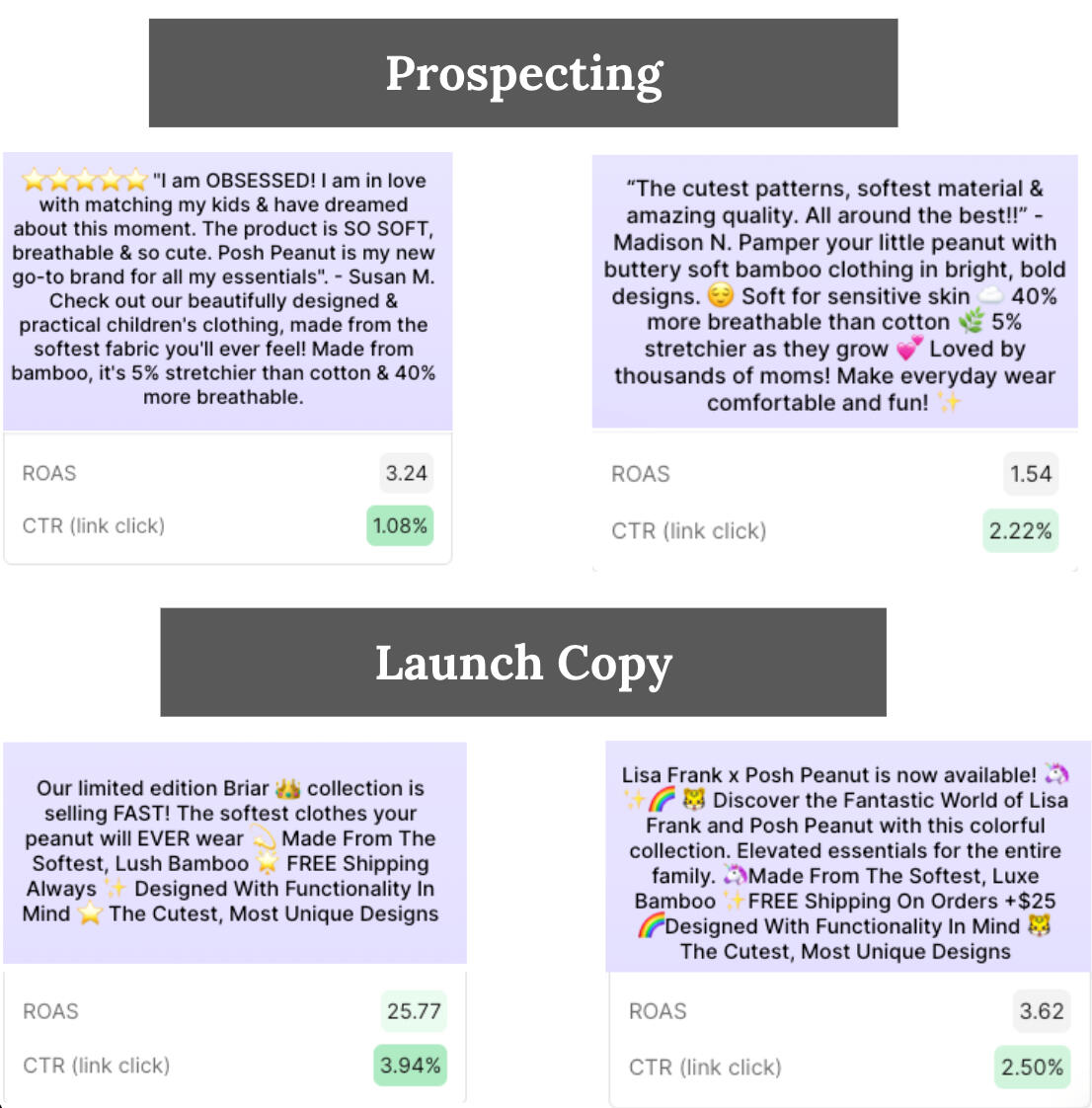 Analyzed high-performing Meta ad copy to identify what drives CTR and ROAS across prospecting and launch campaigns.